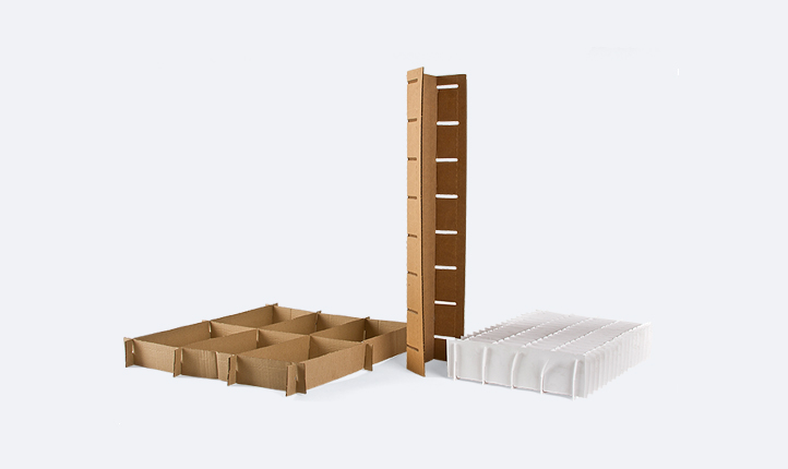 Partición que consta de dos tipos de partes, un lado A que cubre el largo de la caja y un lado B que cubre el ancho de la misma. Dependiendo de la cantidad de cada una de estas partes es la cantidad de espacios que se obtienen para acomodar el producto. El objetivo de las divisiones es evitar que los productos se muevan y se golpeen entre sí.